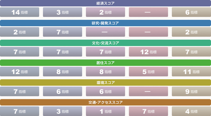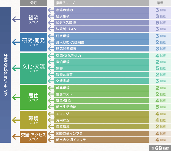 そして、69の指標を都市別に指数化したうえで、それぞれの分野のなかで指標グループに分配してグループ毎のスコアを算出します。