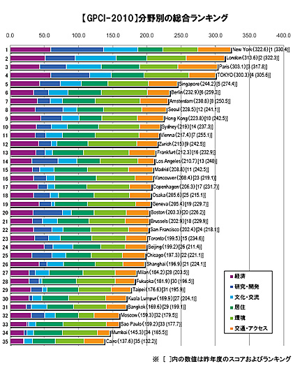 2010年の分野別総合ランキングは、1位:ニューヨーク、2位:ロンドン、3位:パリ、東京は4位である。総合ランクトップ4都市は2008年に日本で初の都市総合力ランキングとしてGPCIを発表して以来、3年連続で同様の結果となった。