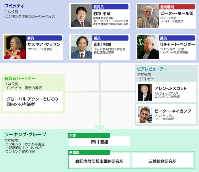 調査・研究の推進にあたり、都市評価に関する世界的権威であるピーターホール卿をはじめとする学識者や各界の識者等が参画し、さらに第三者のピアレビュー(専門家による評価)を受け、ランキングに客観性を保つようにしています。