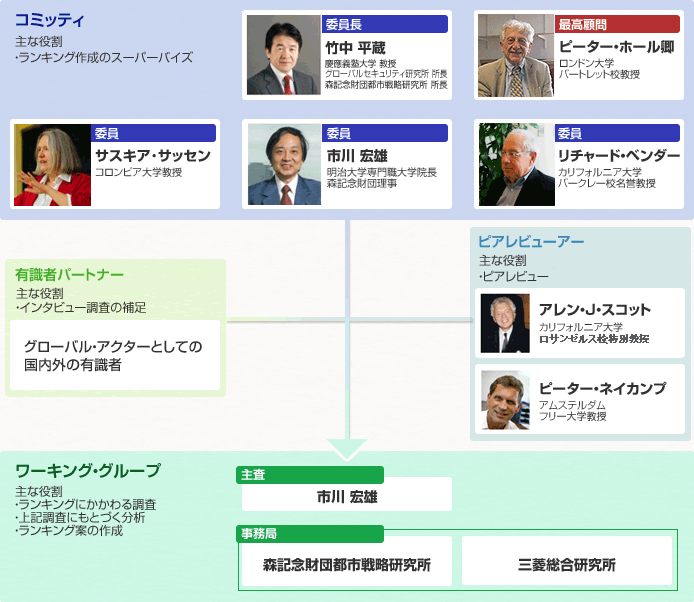 調査・研究の推進にあたり、都市評価に関する世界的権威であるピーターホール卿をはじめとする学識者や各界の識者等が参画し、さらに第三者のピアレビュー(専門家による評価)を受け、ランキングに客観性を保つようにしています。