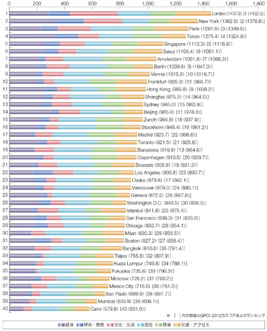 ロンドンは居住分野でスコアを下げたものの、経済、研究・開発、環境分野でスコアを上げ、結果的にロンドンとニューヨークの総合スコアの差は広がった。また、パリと東京が大きくスコアを落として2位との差が広がり、4位東京と5位シンガポールとのスコア差は縮小した。東京とパリとの関係だけで見ると、スコア差は昨年より縮小しており、東京での五輪開催決定を追い風に3位へのランクアップの可能性が出てきている。
