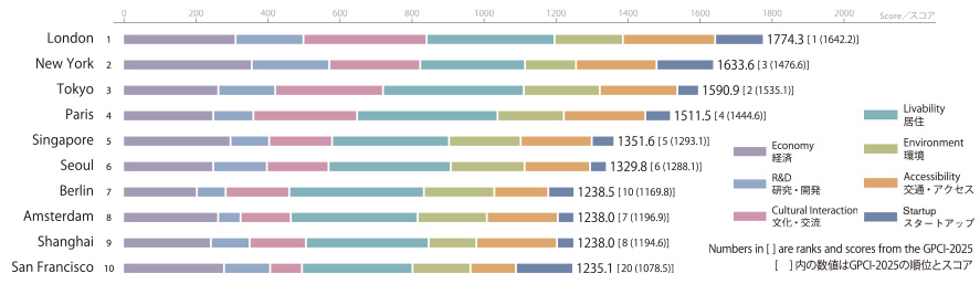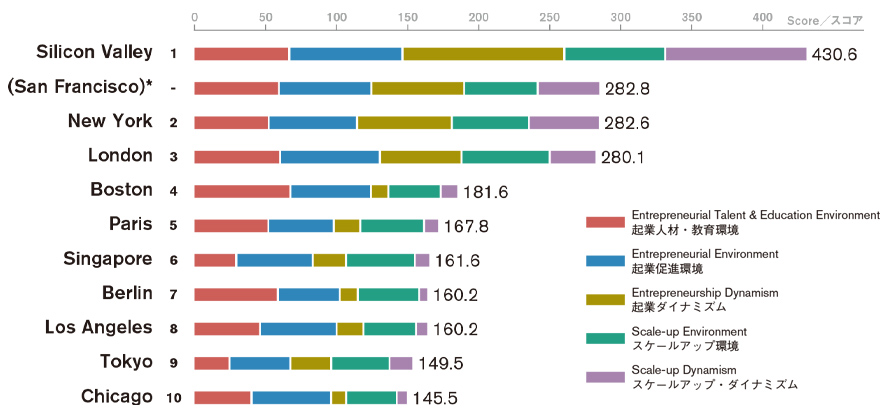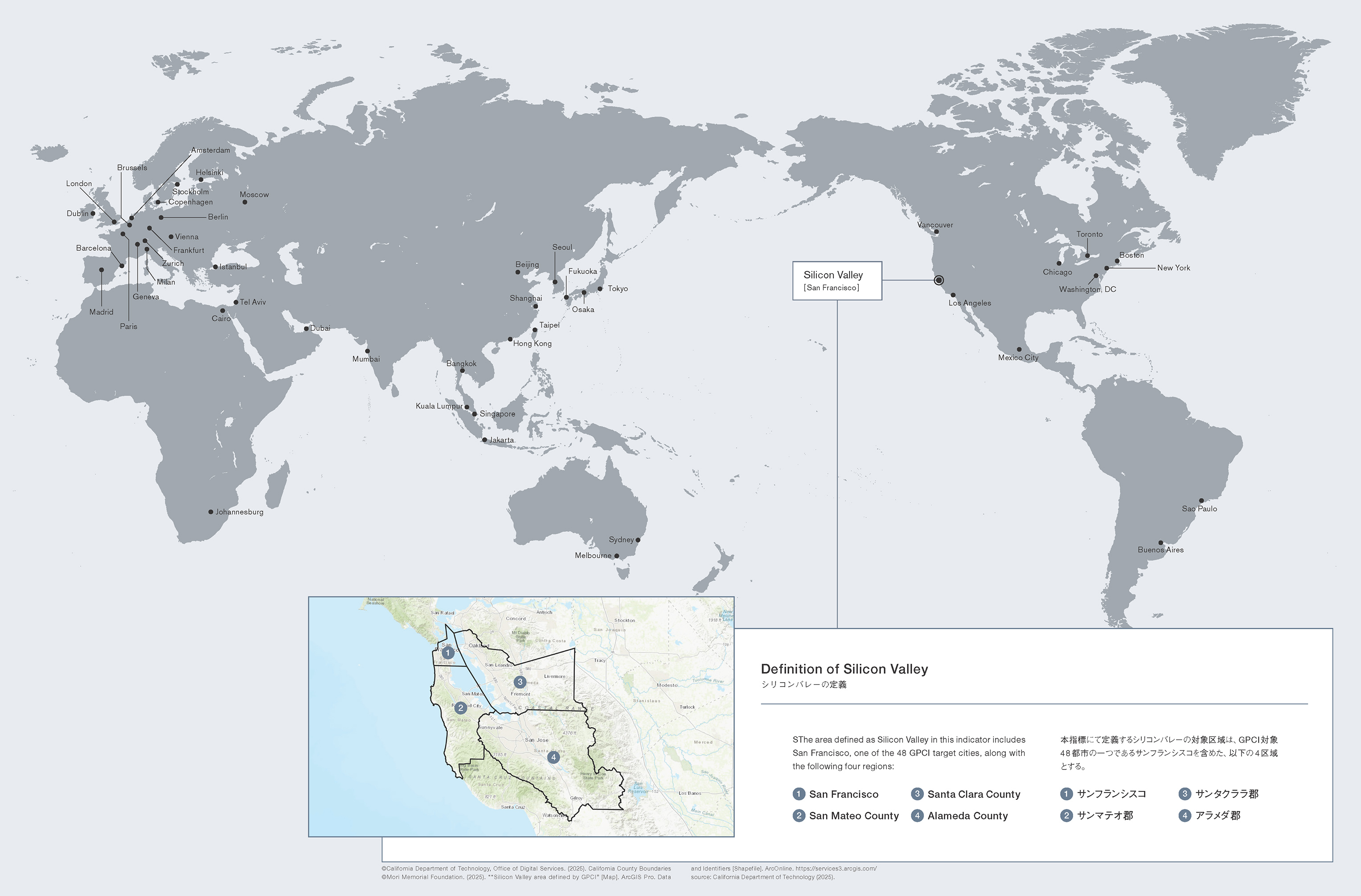 As evaluation factors for the startup field, 21 indicators grouped into 5 categories were selected. Each indicator was scored and averaged to calculate the score for each indicator group, which were then combined to derive the overall score for the startup function. In the startup functions rankings, San Francisco was redefined as the broader metropolitan area of “Silicon Valley.” As a result, the analysis covered 47 cities from the GPCI list, excluding San Francisco, plus 1 area (Silicon Valley).The overall ranking for GPCI-Startup Ecosystems was created by adding the startup function scores to the scores from the six functions of the GPCI.