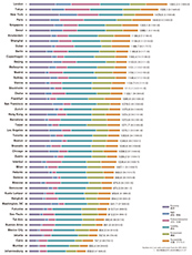 全都市の中で最もスコア下落の大きかった3位のニューヨークは、2012年から保ってきた2位の座を退く結果となった。特に「物価水準の低さ」が最下位となった居住分野や、「気温の快適性」が悪化した環境分野の低迷が目立つ。一方「上場株式時価総額」や「研究開発費」ではトップを独走し、経済分野、研究・開発分野では引き続き1位を維持している。