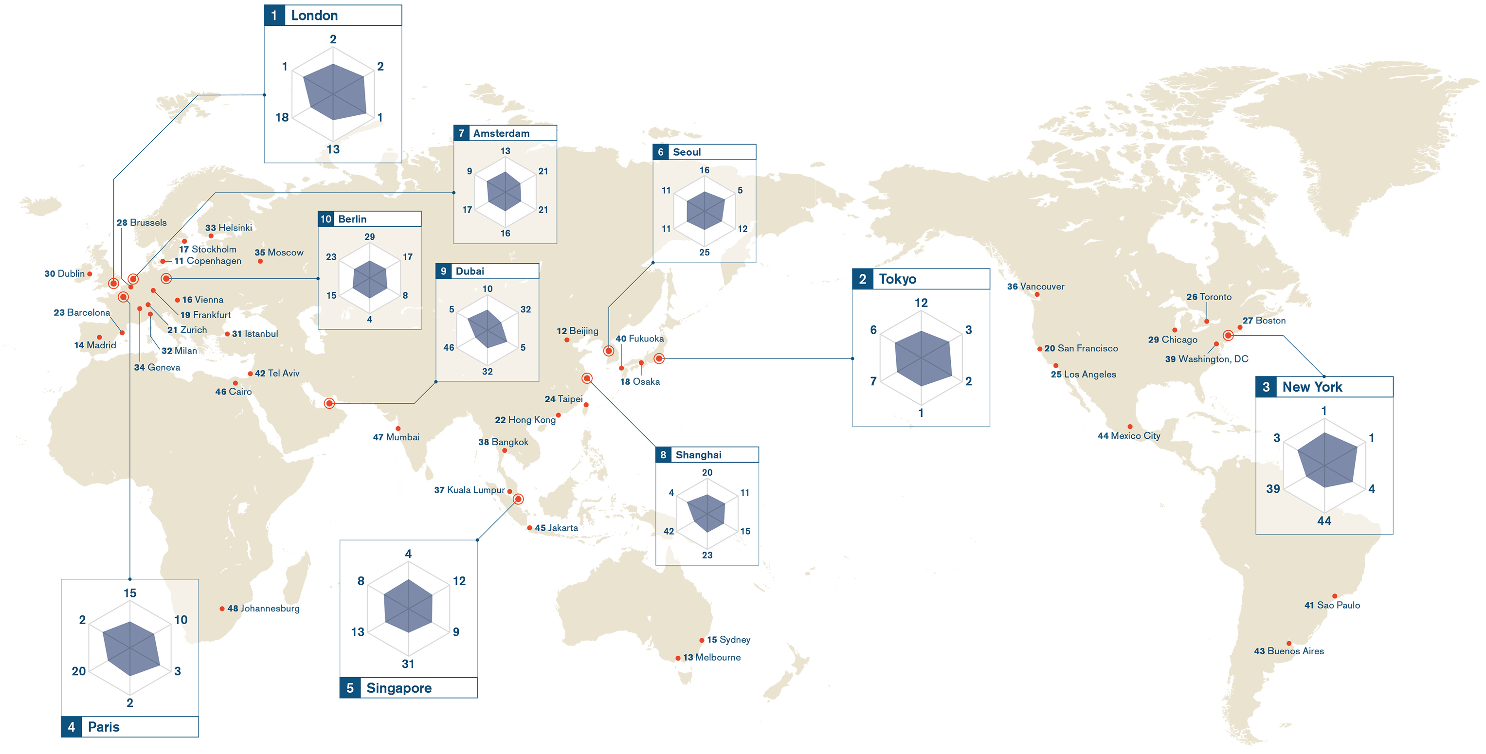1位のロンドンは総合スコアを落としたものの、2012年からトップを維持し続けている。文化・交流分野、交通・アクセス分野では1位を、経済分野、研究・開発分野では2 位を堅持している。居住分野、環境分野では順位を大きく下げたが、「緑地の充実度」で1位を獲得するなどポジティブな変化も見られた。