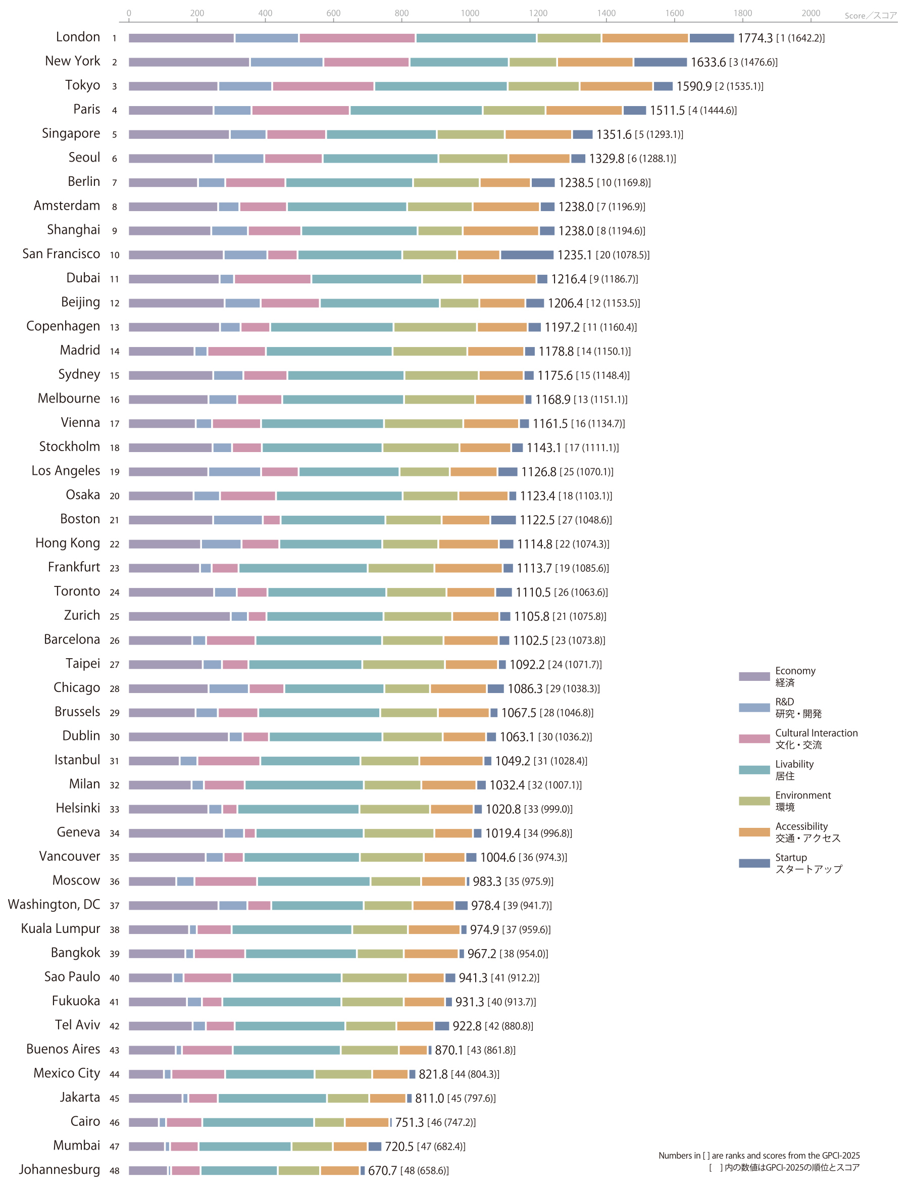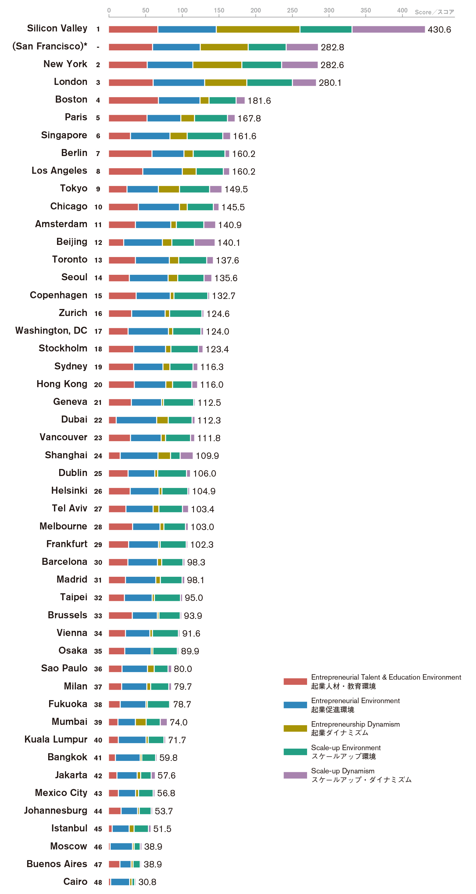 As evaluation factors for the startup field, 21 indicators grouped into 5 categories were selected. Each indicator was scored and averaged to calculate the score for each indicator group, which were then combined to derive the overall score for the startup function. In the startup functions rankings, San Francisco was redefined as the broader metropolitan area of “Silicon Valley.” As a result, the analysis covered 47 cities from the GPCI list, excluding San Francisco, plus 1 area (Silicon Valley).The overall ranking for GPCI-Startup Ecosystems was created by adding the startup function scores to the scores from the six functions of the GPCI.