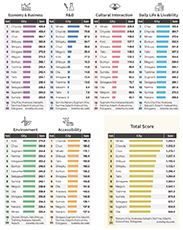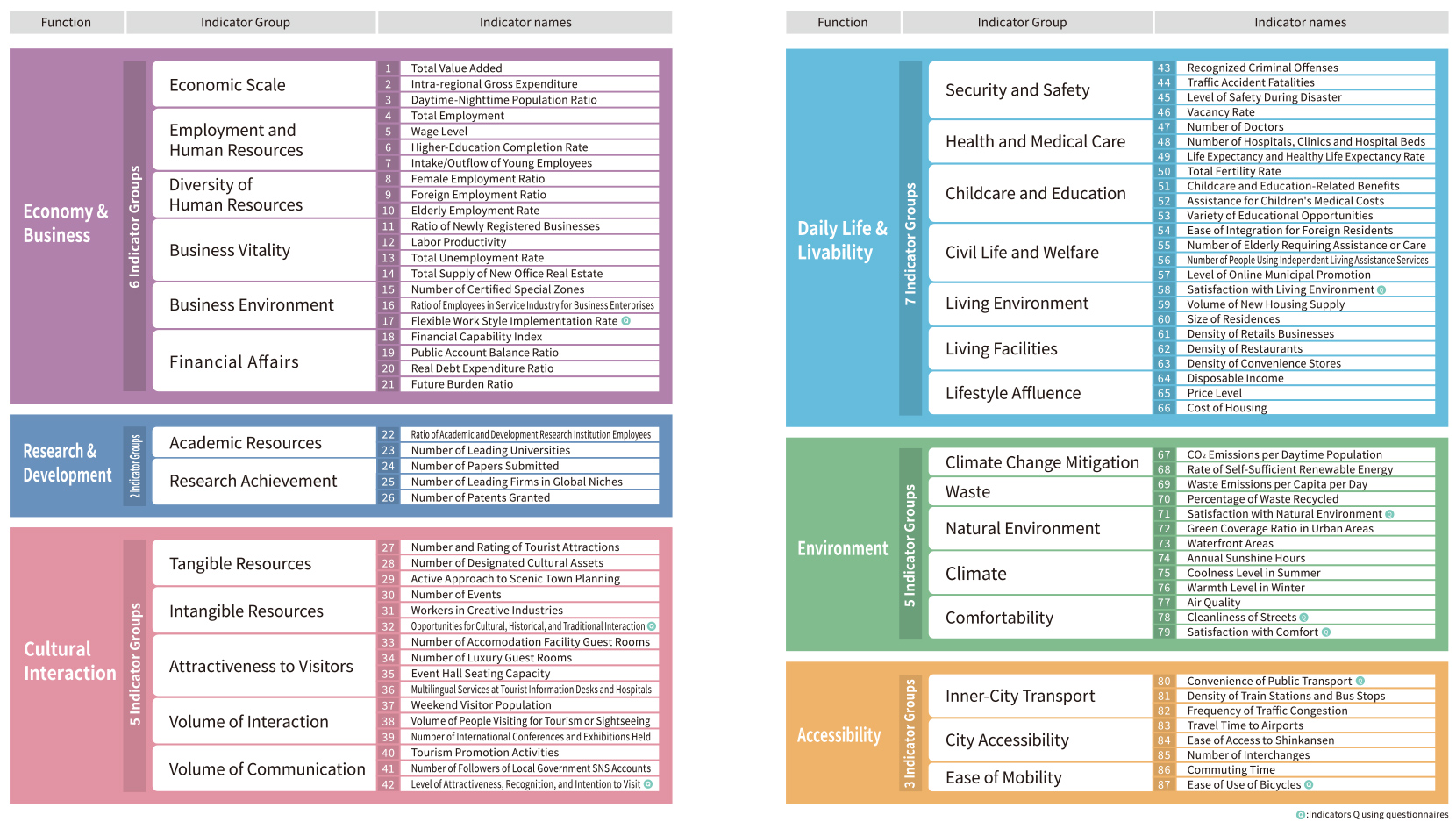In Japan Power Cities, 6 functions (Economy & Business, Research & Development, Cultural Interaction, Daily Life & Livability, Environment, and Accessibility) were created to represent the components of cities. Furthermore, 26 indicator groups were established to represent the primary components of those functions, with 87 indicators finally being determined.
